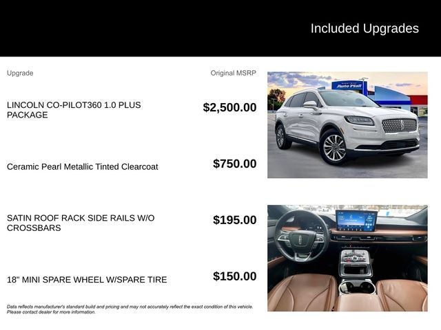• LINCOLN CO-PILOT360 1.0 PLUS PACKAGE: Includes Active Park Assist 2.0, Distance Indication & Alert, 360 Degree Camera with Rear Camera Wash, Adaptive Cruise Control with stop-and-go and lane centering assist, Evasive Steering Assist, and Forward-Side-Rear Parking Sensors